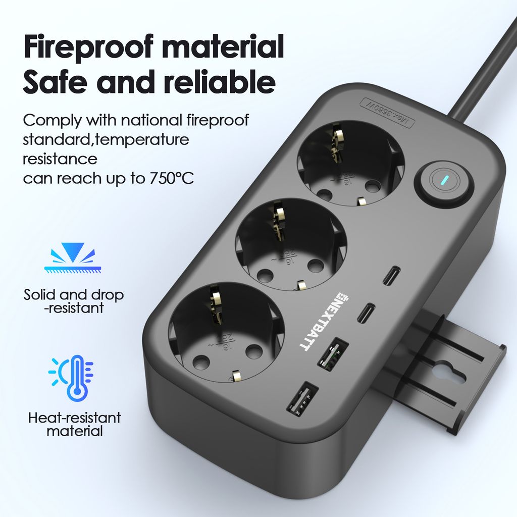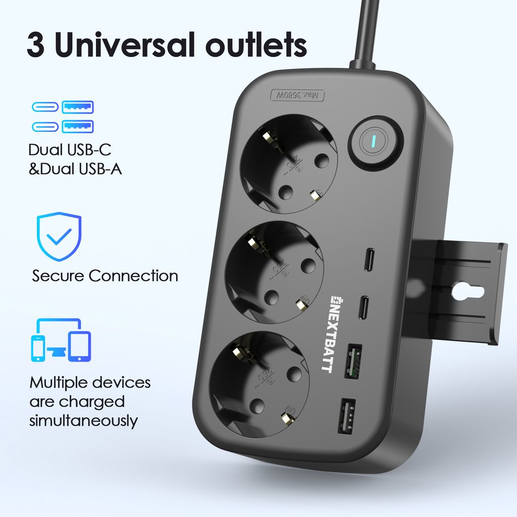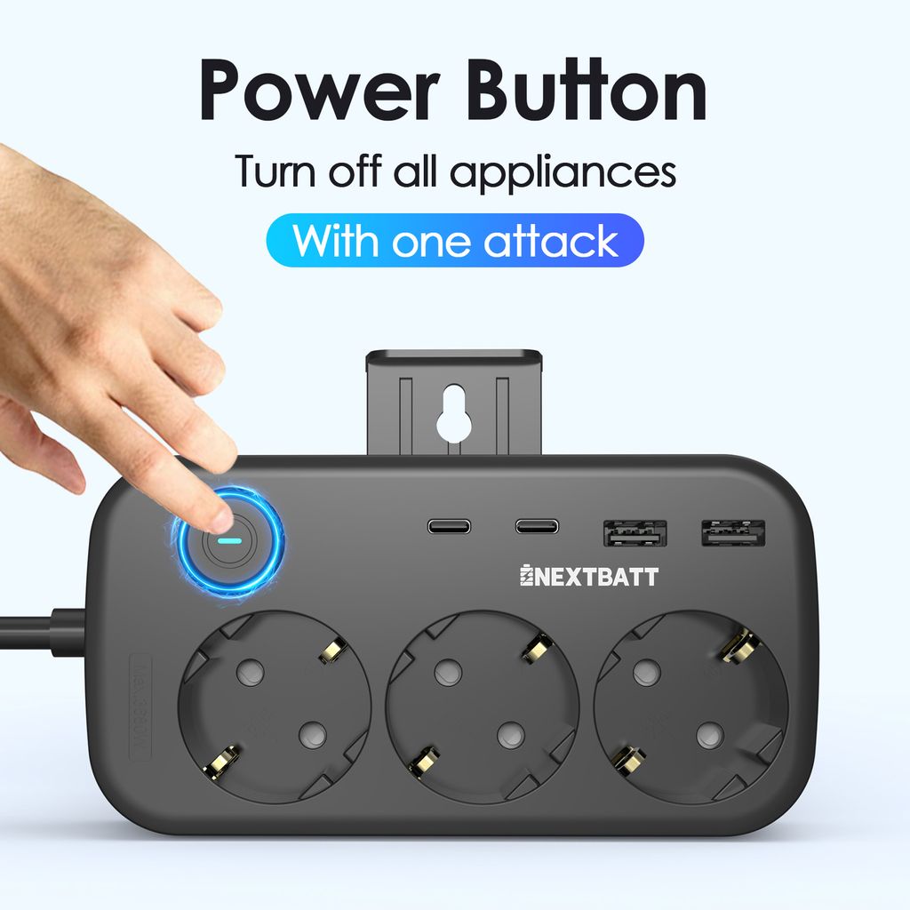 NEXTBATT grenuttag ger dig ström till alla dina prylar på ett och samma ställe. Med tre jordade eluttag, två USB-C-portar och två USB-A-portar kan du ladda mobil, laptop, surfplatta, hörlurar och mer samtidigt - perfekt för skrivbordet, gaminghörnan eller nattduksbordet.