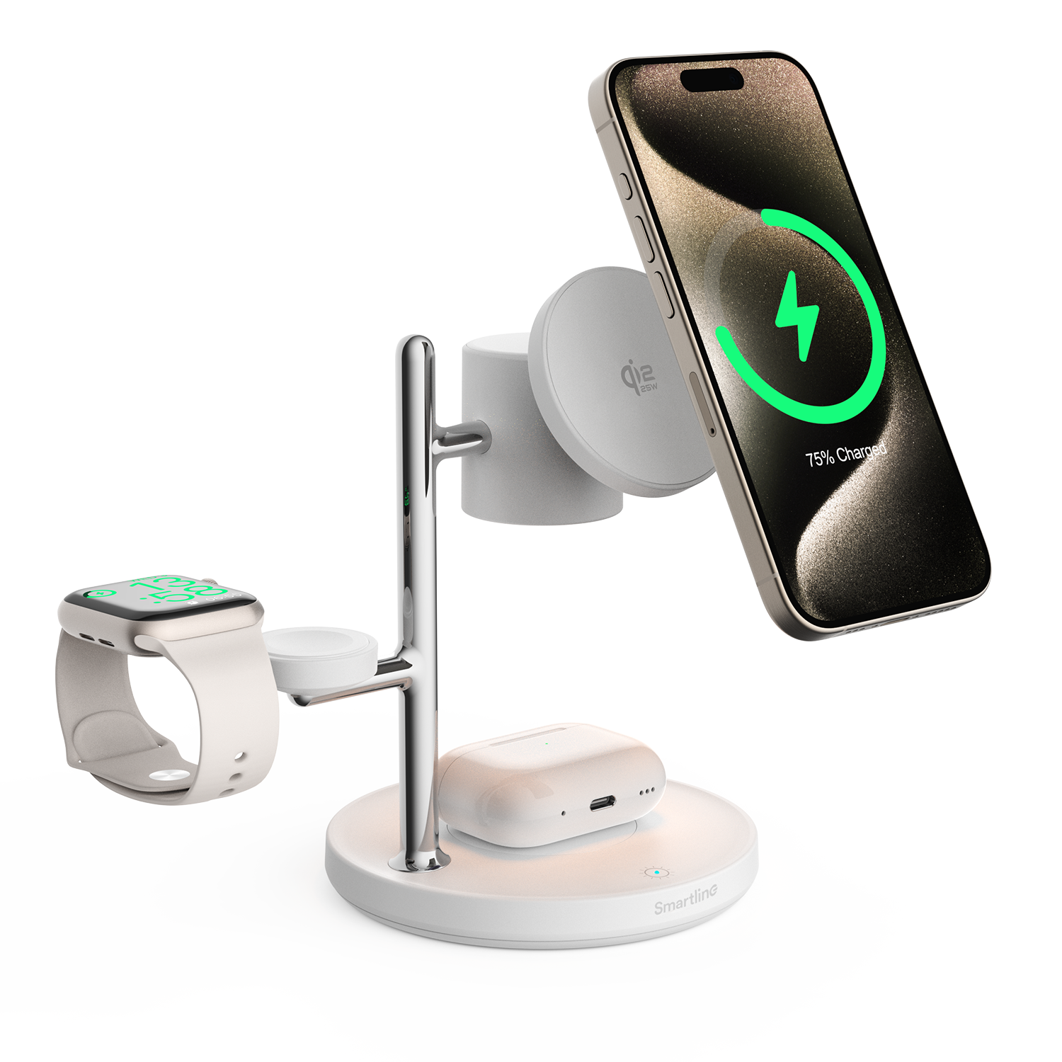 Den smidiga designen gör laddaren enkel att ta med på resa eller flytta runt hemma när du vill uppgradera din teknikstation. Trådlös snabbladdning upp till 25W ger mobilen ny energi snabbt medan klocka och hörlurar laddas parallellt. USB-C till USB-C kabel ingår så du kan börja ladda direkt. Strömadapter rekommenderas på 45W och säljs separat.