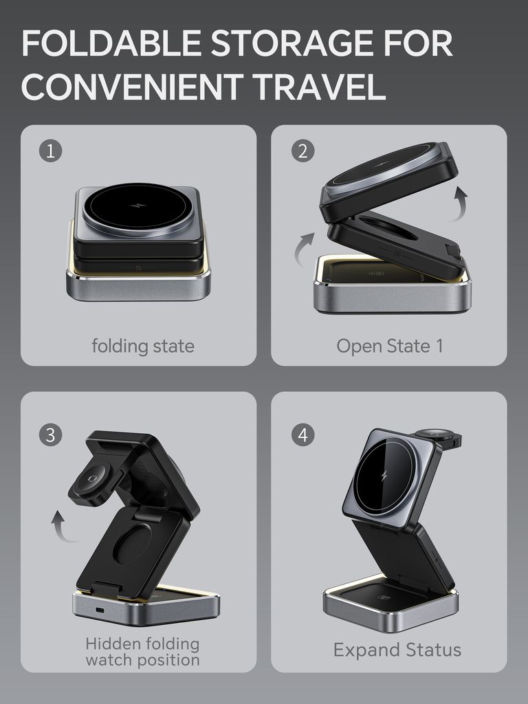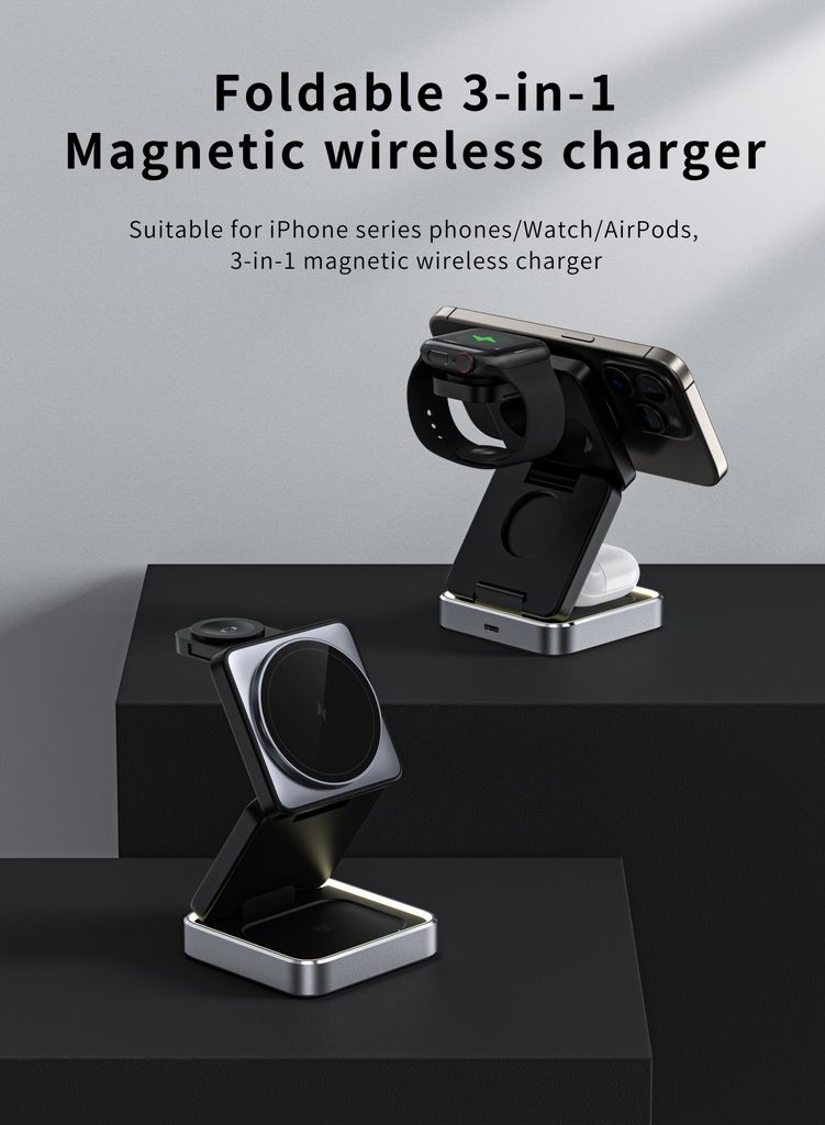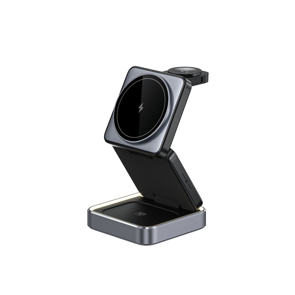 Slipp kabeltrassel och ladda allt på ett och samma ställe med SiGNs 3-in-1 hopfällbara trådlösa magnetiska laddningsstation 15W. Den smarta vikbara designen gör den perfekt att ta med på resor, samtidigt som den håller ditt skrivbord snyggt och organiserat.