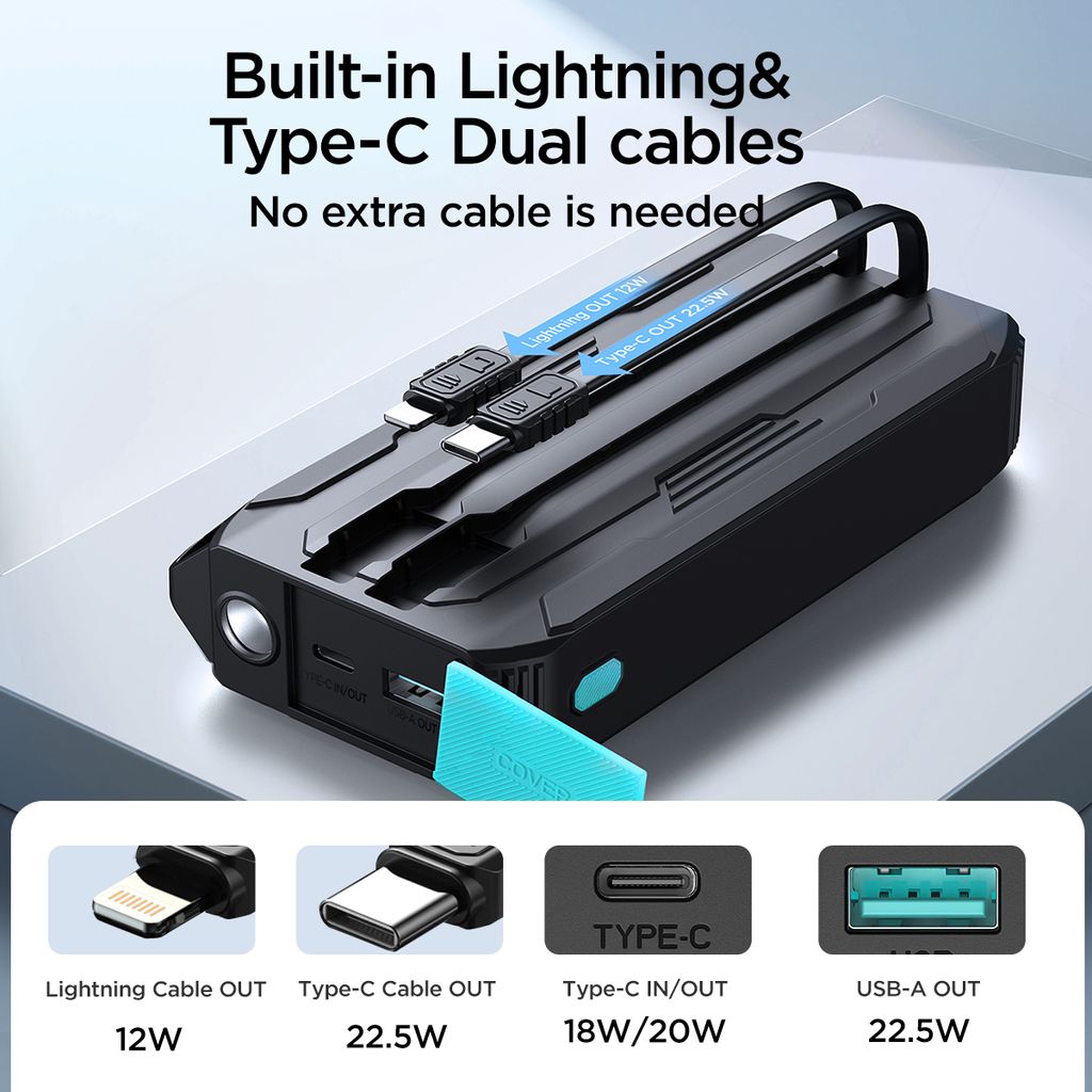 - Inbyggda USB-C- och Lightning-kablar