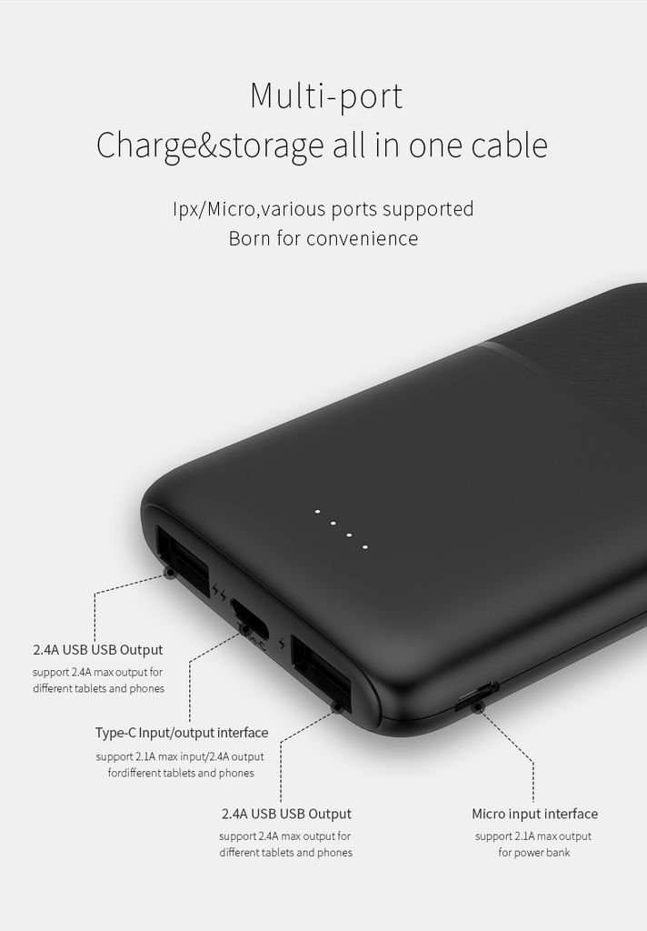 Powerbanken är utrustad med en USB-C-utgång och två USB-A-utgångar, vilket gör att du kan ladda flera enheter samtidigt. USB-C-porten används även för att ladda powerbanken. Den tydliga LED-indikatorn visar batteristatus så du vet när det är dags att ladda upp den igen. Den ultratunna konstruktionen gör den enkel att ta med överallt.