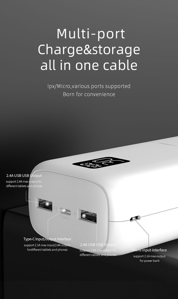 Powerbanken är utrustad med en USB-C-port och två USB-A-portar, så du kan ladda upp till tre enheter samtidigt. USB-A-portarna stöder upp till 2.4A för snabb och stabil laddning, vilket gör att dina enheter snabbt är redo att användas igen. Du laddar enkelt powerbanken via USB-C eller Micro-USB, vilket ger flexibel och smidig användning oavsett kabel.