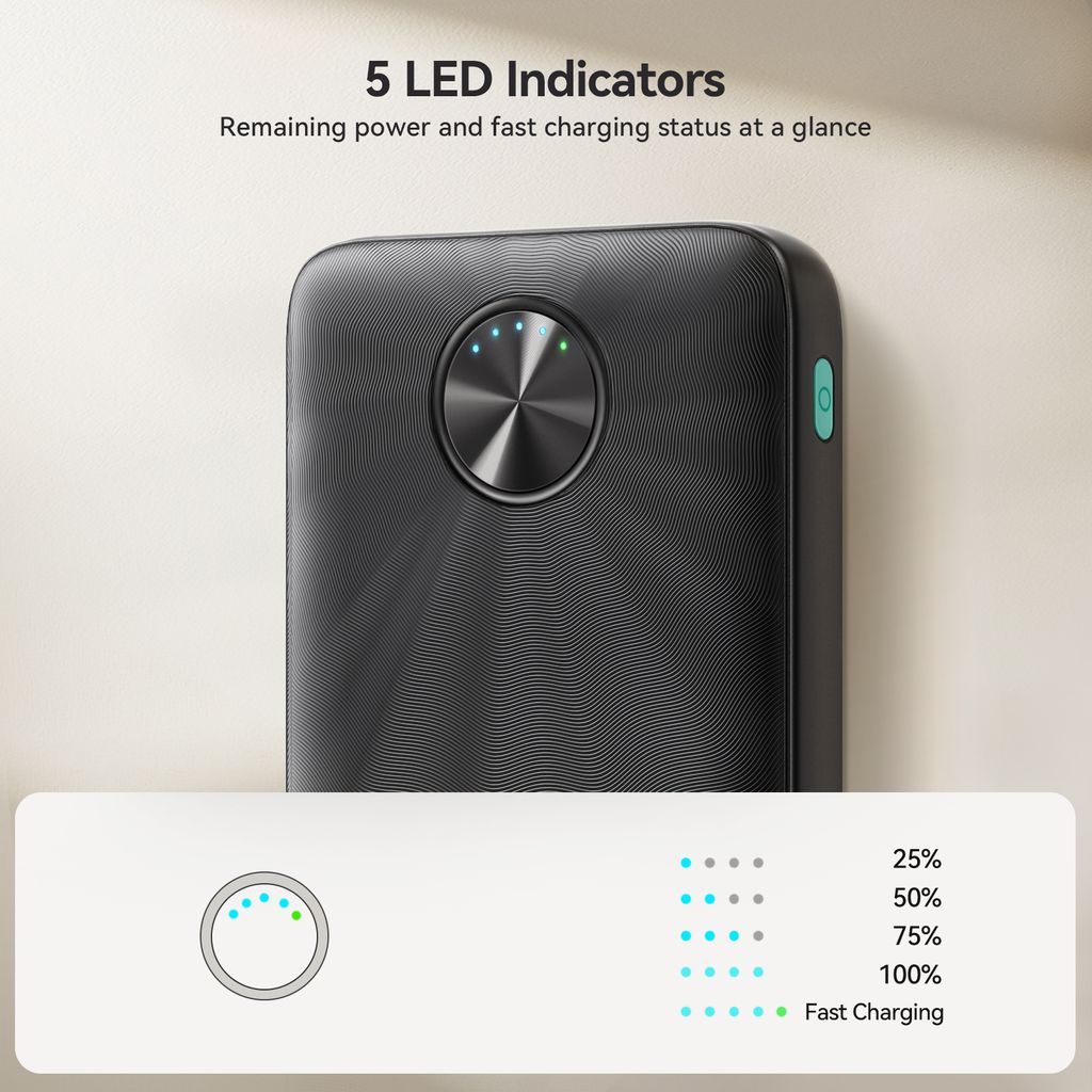 USB-C-porten stöder tvåvägs snabbladdning, vilket innebär att både powerbanken och dina enheter laddas snabbt. LED-indikatorerna visar tydligt hur mycket batteri som finns kvar, så du alltid har koll på din extra kraft.
