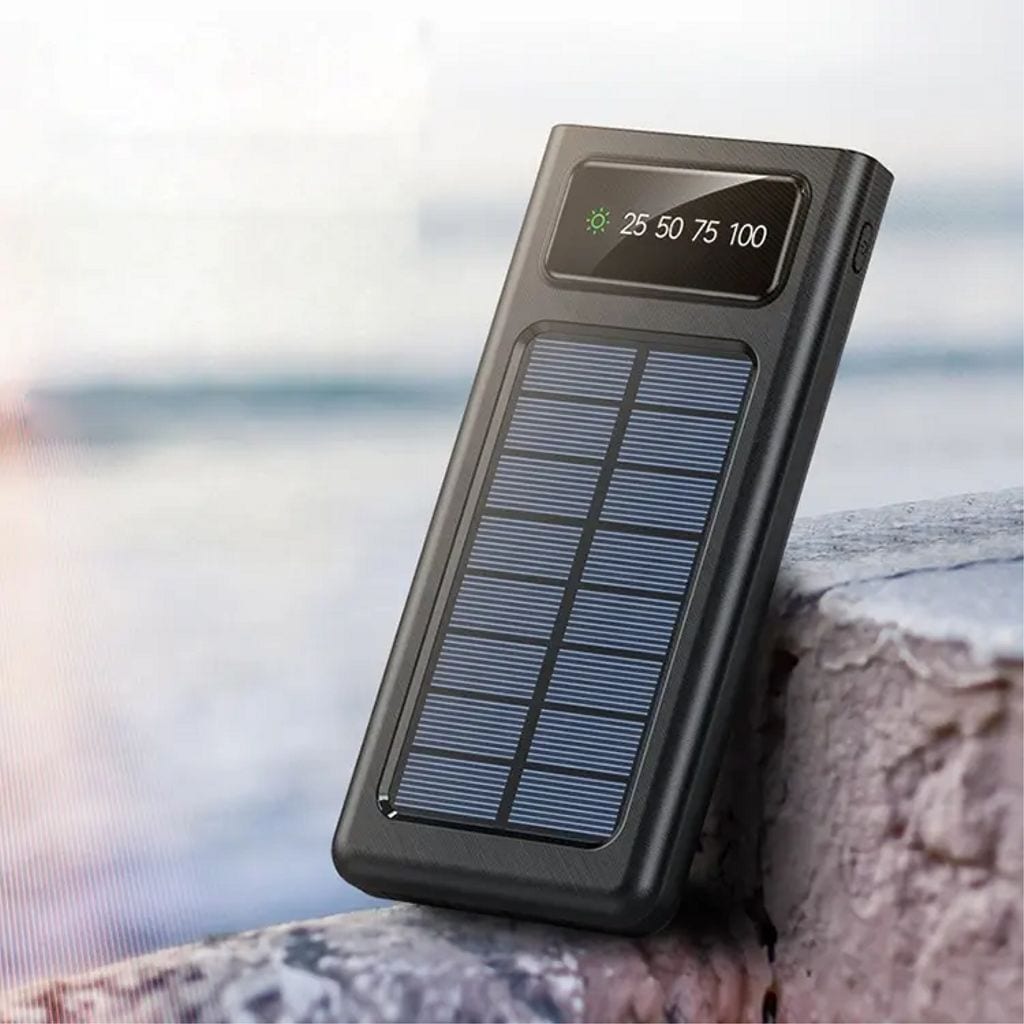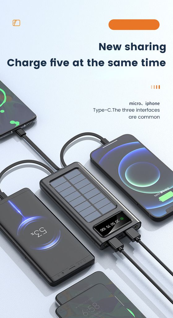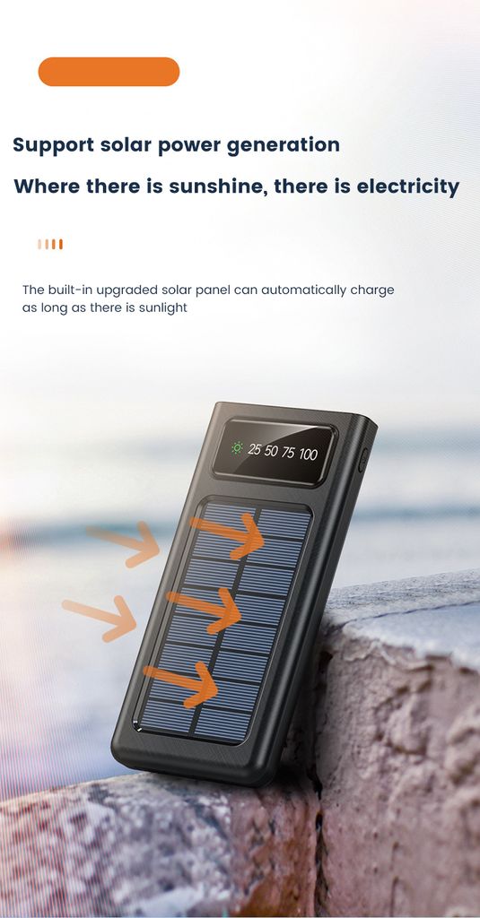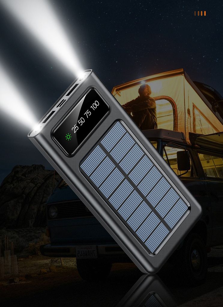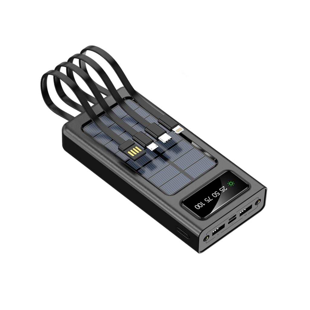 Ladda powerbanken via USB-C, Micro-USB eller låt solen göra jobbet med de inbyggda solpanelerna. De integrerade kablarna - USB-C, Lightning, Micro-USB och USB-A - gör att du alltid är redo att ladda utan att släpa på extra kablar. LED-displayen visar tydligt batterinivån, och den kraftfulla LED-ficklampan hjälper dig när mörkret faller.