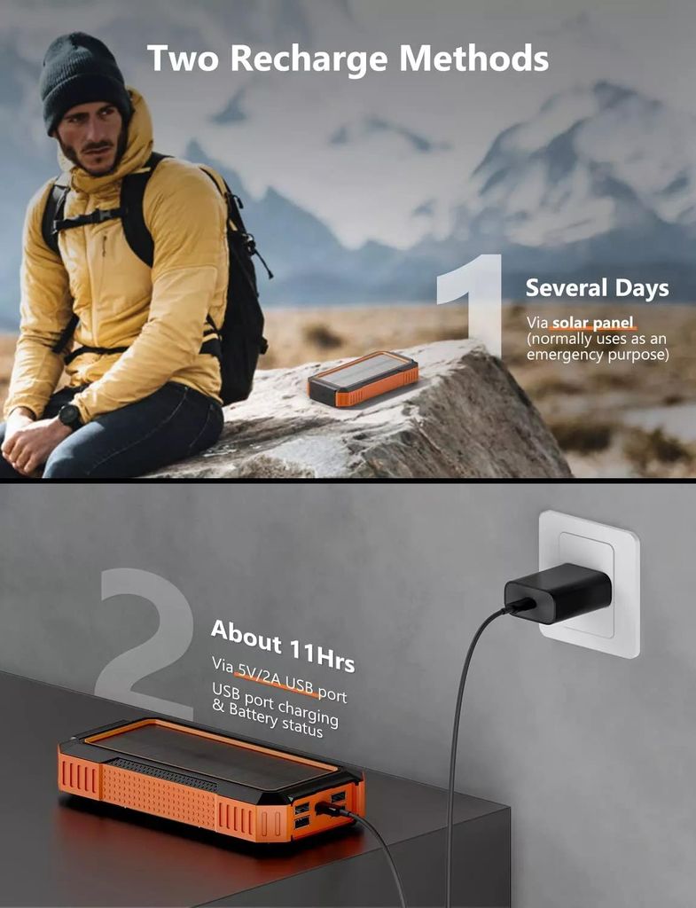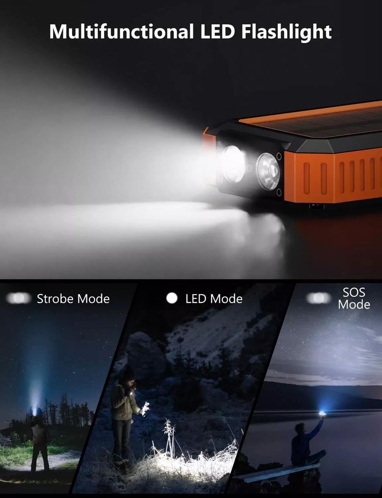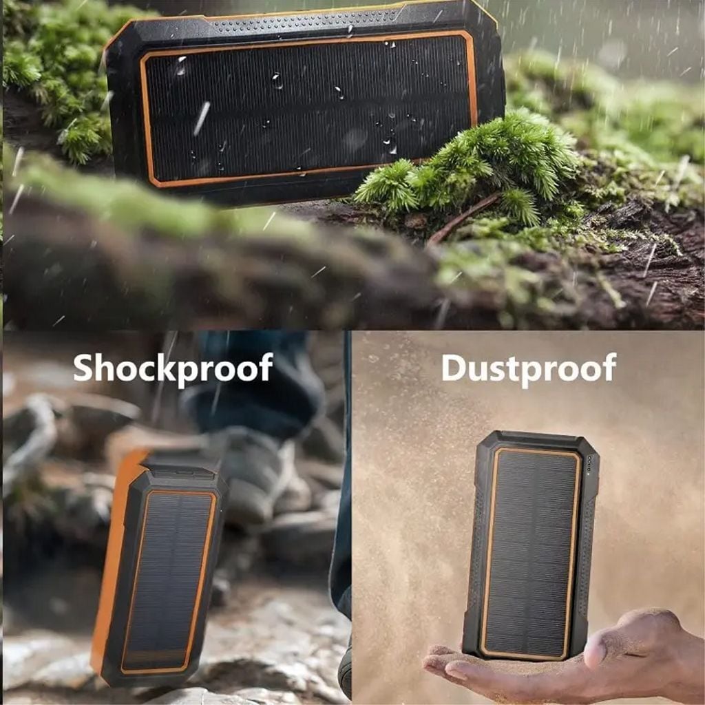 Fäst mobilen på den trådlösa laddningsytan eller använd USB-portarna för snabb och flexibel laddning. Den inbyggda ficklampan lyser upp vägen i mörkret och kompassen hjälper dig att hålla rätt riktning - perfekt för vandring, camping och alla dina outdoor-äventyr.