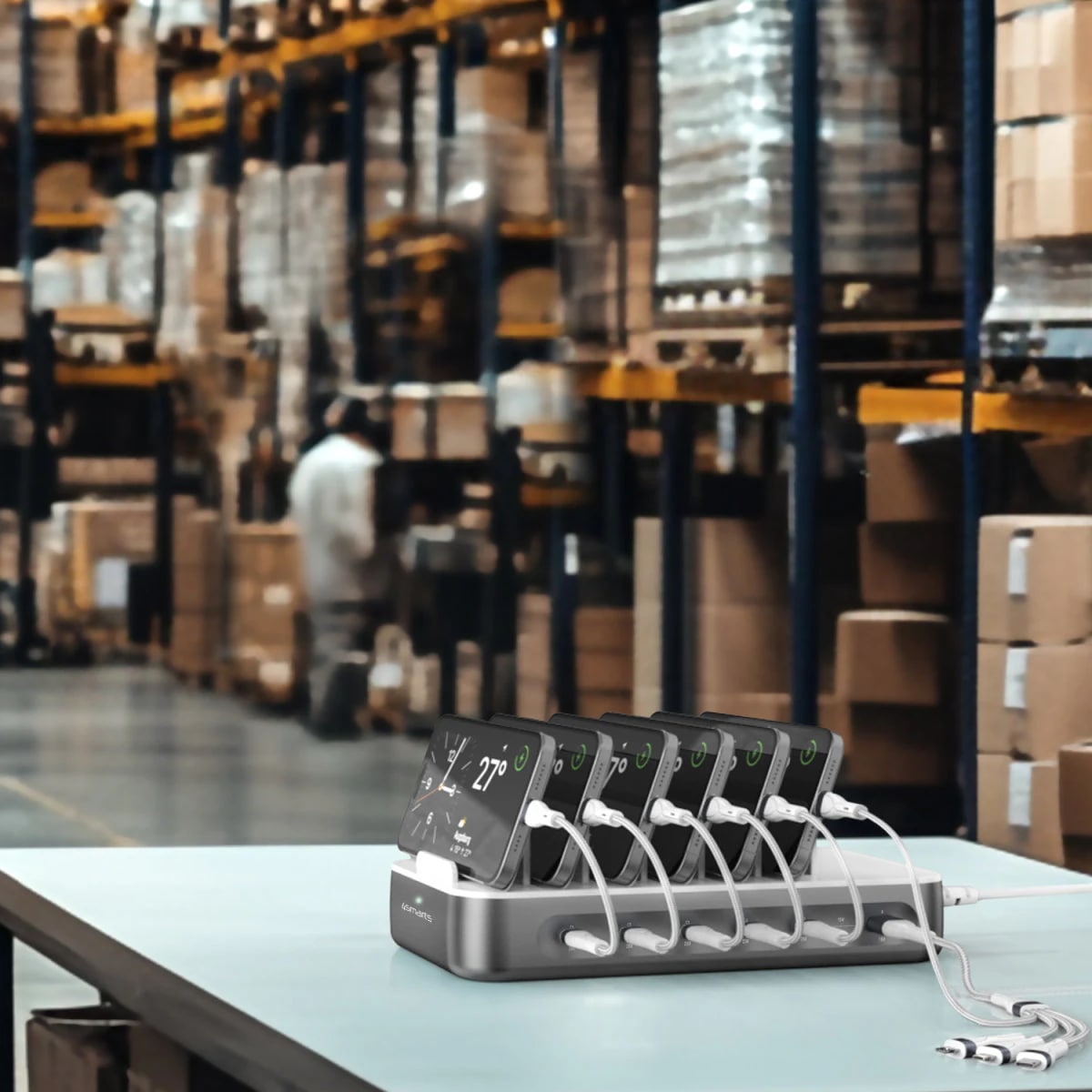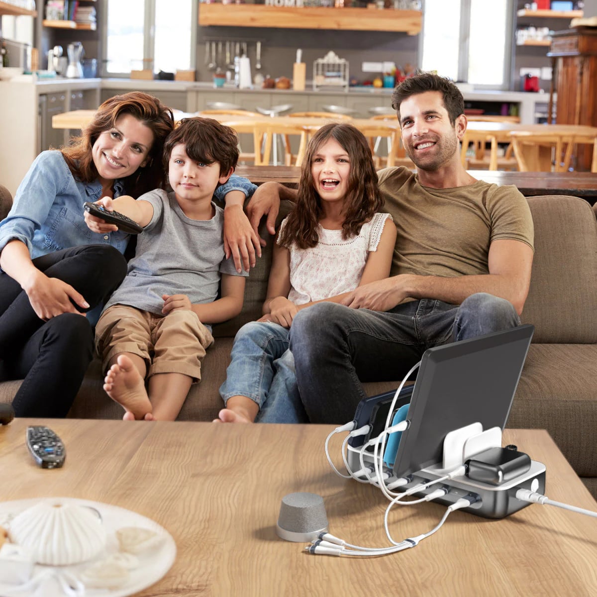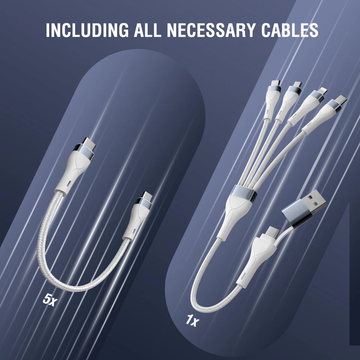 Här är laddningsstationen som löser laddningspusslet en gång för alla. Med kapacitet att ladda upp till nio enheter samtidigt slipper du bråk om laddare och tomma batterier. Fem USB-C-portar, en USB-A-port och medföljande kablar gör det enkelt att ladda mobiler, surfplattor, hörlurar, smartklockor och andra favoritprylar på ett och samma ställe. Med hela 100 W i total effekt går laddningen snabbt, smidigt och utan väntetid.
