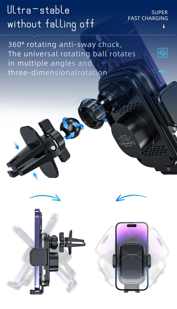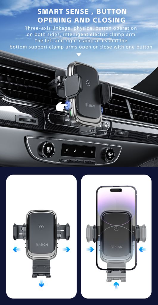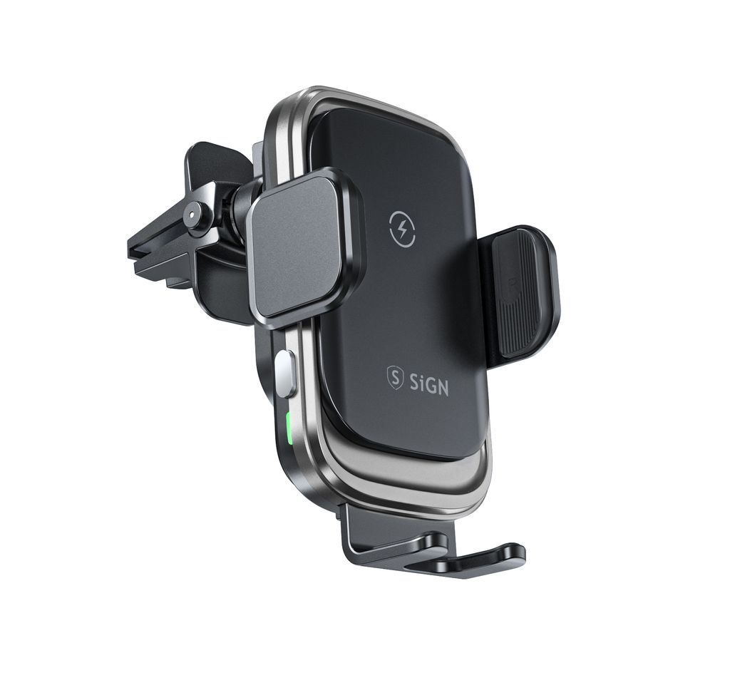 Ge mobilen en VIP-plats i bilen. SiGN mobilhållare för bil med trådlös laddning gör körningen både smidigare och smartare. Placera mobilen i hållaren så startar Qi-laddningen automatiskt och batteriet fylls på medan du kör. De smarta touchsensorerna öppnar och stänger klämmorna automatiskt när du trycker, vilket gör att du enkelt kan sätta i eller ta ur telefonen med en hand. Hållaren monteras snabbt i bilens ventilationsgaller och ger en stabil position med tydlig överblick över skärmen. Den kompakta designen i aluminiumlegering och glas ger en stilren känsla och hållbar konstruktion. Perfekt när du vill kombinera mobilhållare och trådlös laddning i bilen.