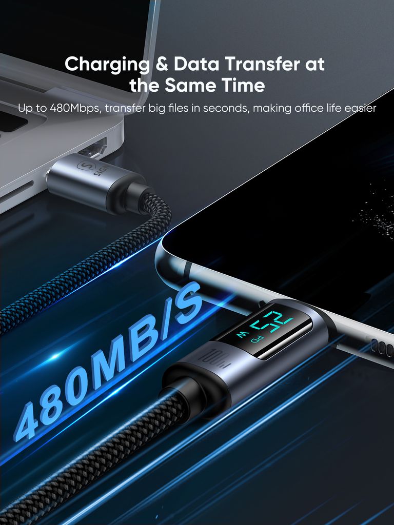 Den inbyggda displayen visar exakt hur snabbt din enhet laddas i realtid - snyggt, smart och full kontroll. Kabeln klarar även dataöverföring upp till 480 Mbps, perfekt när du vill flytta filer snabbt. Den slitstarka designen gör att den klarar livet i väskan, på skrivbordet och överallt däremellan.