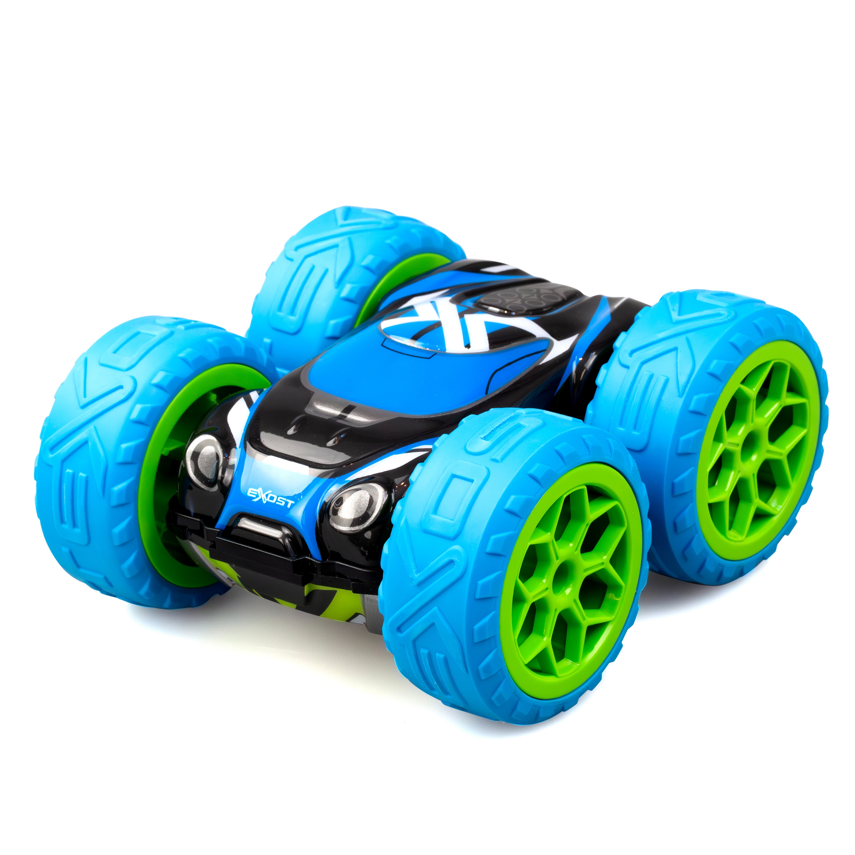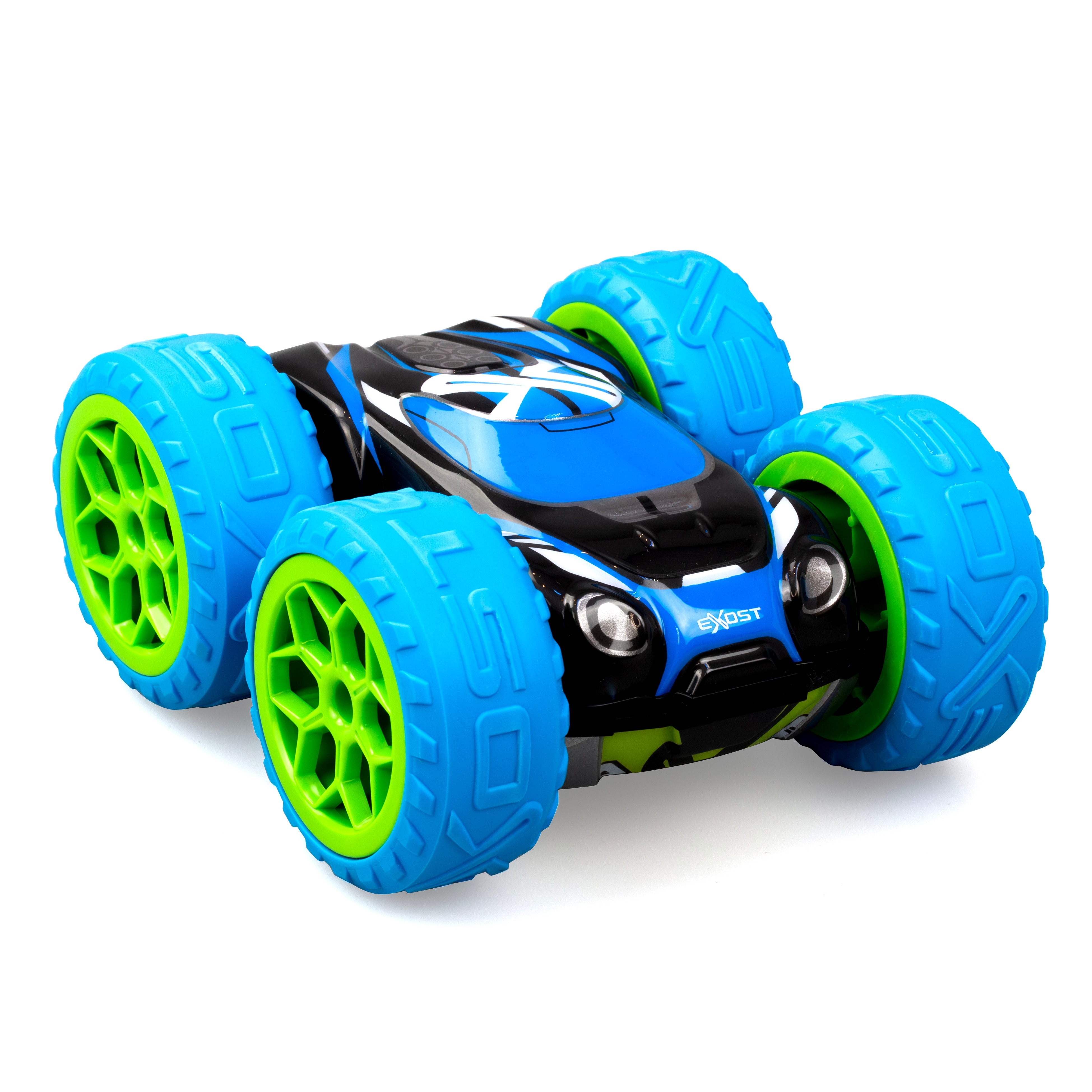 Bilen drivs av ett uppladdningsbart batteri som laddas smidigt via USB-C, så den snabbt är redo för nästa stunt. Med 2,4 GHz-styrning kan flera radiostyrda bilar köras samtidigt utan störningar. De tåliga EXOST-däcken ger bra grepp på både golv och tuffare underlag, och den dubbelsidiga designen gör att bilen ser lika cool ut oavsett hur den landar.