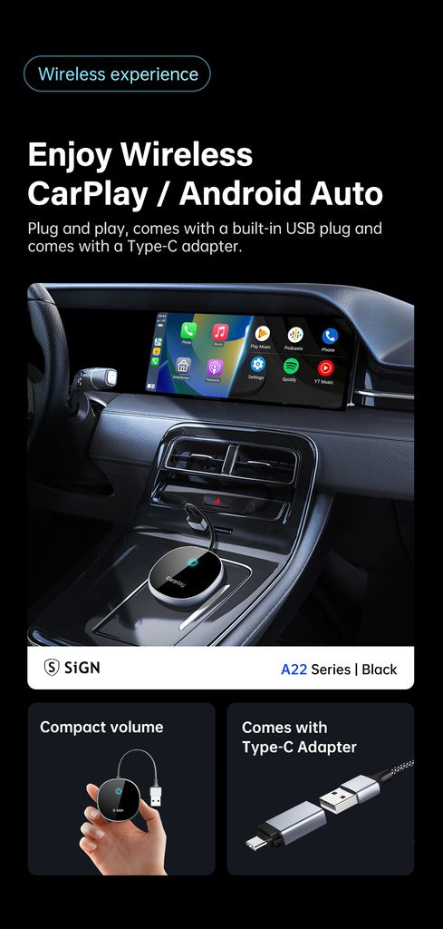 Slipp kablar och gör bilresan smidigare med SiGNs trådlösa CarPlay-adapter. Den förvandlar din befintliga trådbundna CarPlay till en trådlös upplevelse på bara några enkla steg. Koppla upp via Bluetooth och låt din iPhone ansluta automatiskt varje gång du sätter dig i bilen. Du styr allt direkt via bilens skärm, ratt eller originalkontroller precis som vanligt, fast utan kabeltrassel. Perfekt för dig som vill ha en renare och mer bekväm körmiljö. Kompatibel med iPhone 6 och senare med iOS 10 eller högre samt bilar med original trådbunden CarPlay.
