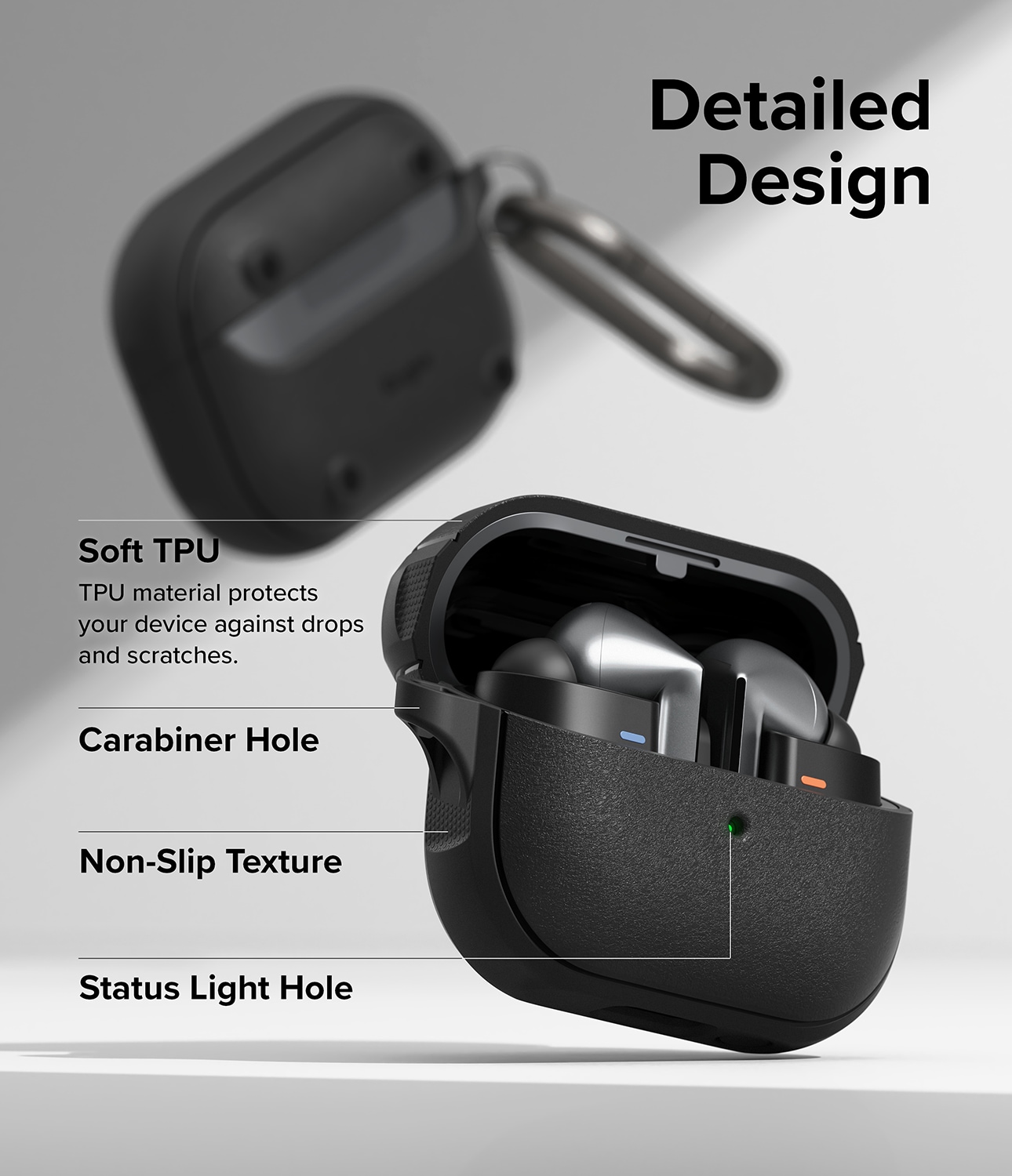 Ge din Samsung Galaxy Buds 3 Pro lite extra stil med det här tuffa skalet från Ringke! Utrustat med MagSafe och en karbinhake är det här skalet redo att hänga med på alla äventyr. Det har en snygg design och skyddar din enhet som en riktig hjälte. Den flexibla och slitstarka TPU med sin matta, granulära yta känns skön att hålla i och håller borta både fingeravtryck och halkiga situationer.