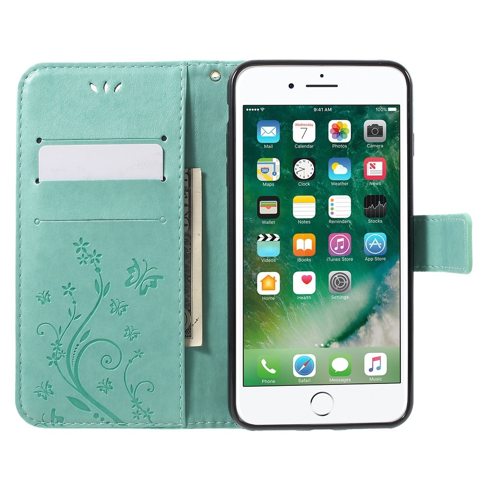 Kika på detta charmiga mobilfodral för Apple iPhone 7 Plus, iPhone 8 Plus, fullt med fladdrande fjärilar och fint mönster som verkligen får din telefon att sticka ut i mängden eller i väskan. Detta plånboksfodral i konstläder är inte bara en fröjd för ögat; det håller också din telefon skyddad från topp till tå mot skador, repor och smuts. Din telefon sätts fast i det inbyggda TPU-skalet och du fäller enkelt locket på fodralet runt mobilen vid användning.