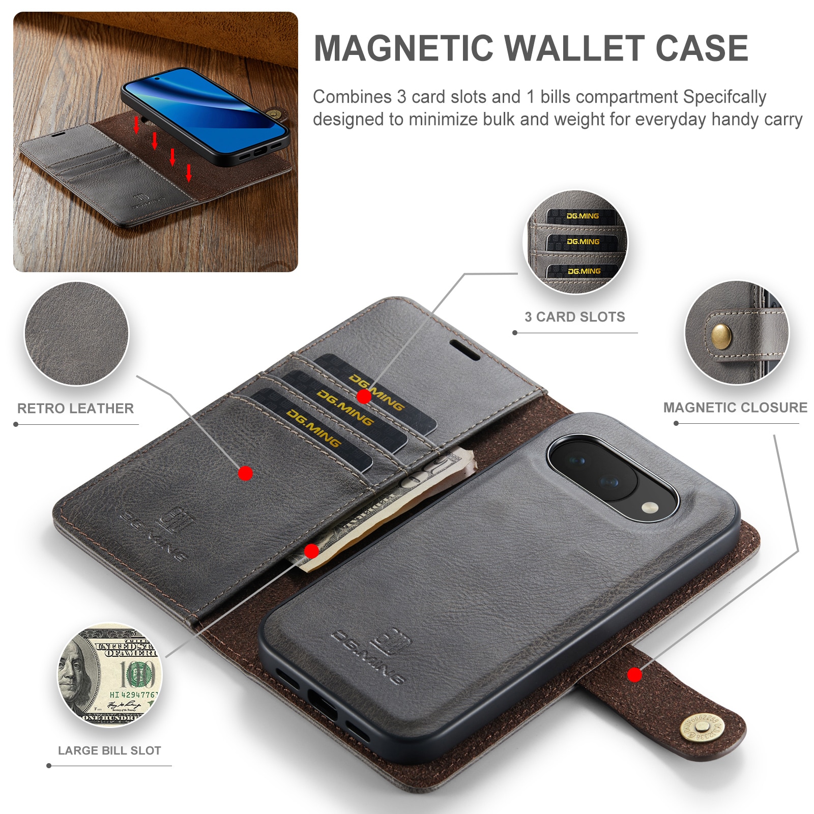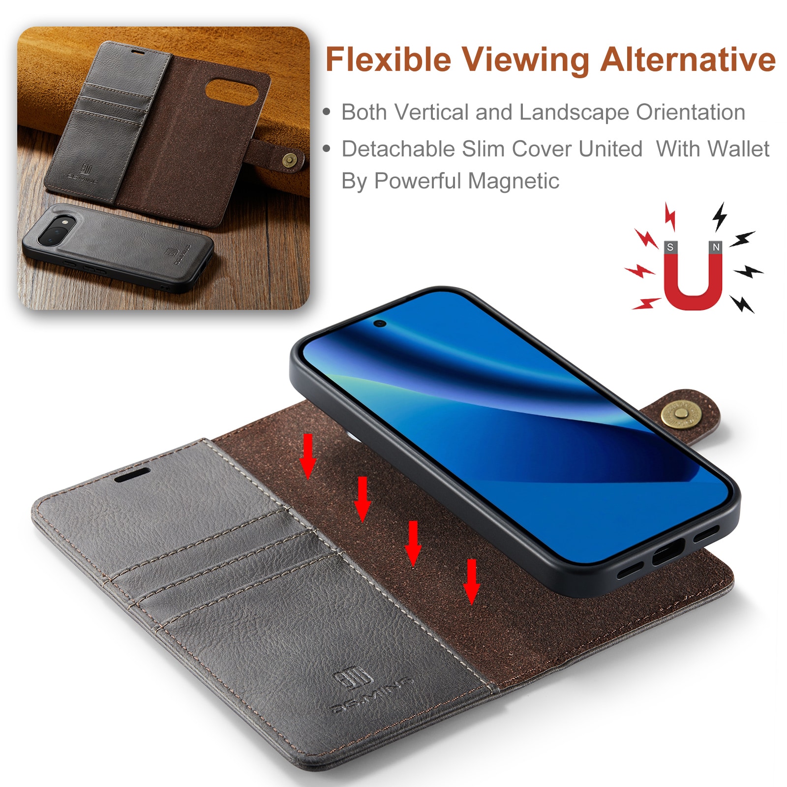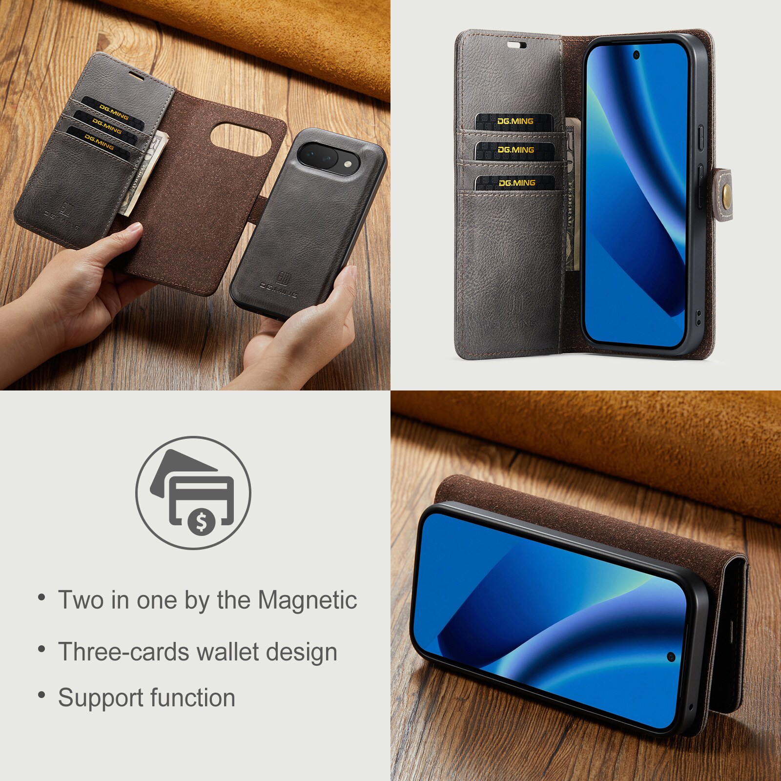 Kolla in vårt smarta fodral med avtagbart magnetskal till Google Pixel 10a från DG.MING. Det här fodralet kombinerar klassisk stil med praktisk funktionalitet. Med det avtagbara skalet kan du enkelt ta bort telefonen från fodralet när du är hemma eller på jobbet, utan att behöva ha med hela fodralet också.