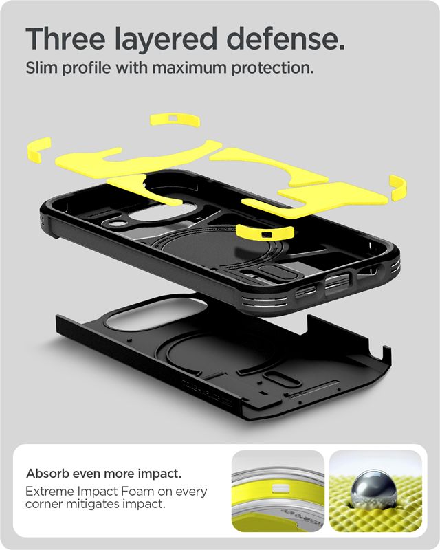 Tack vare fullt MagSafe-stöd fungerar skalet perfekt med MagSafe-laddare och andra smarta tillbehör – klicka bara fast och kör. Insidan består av flexibel TPU med Spigens Air Cushion Technology i hörnen för extra stötskydd, och utsidan är ett hårt polykarbonatskal som ger ett stabilt och tryggt grepp.