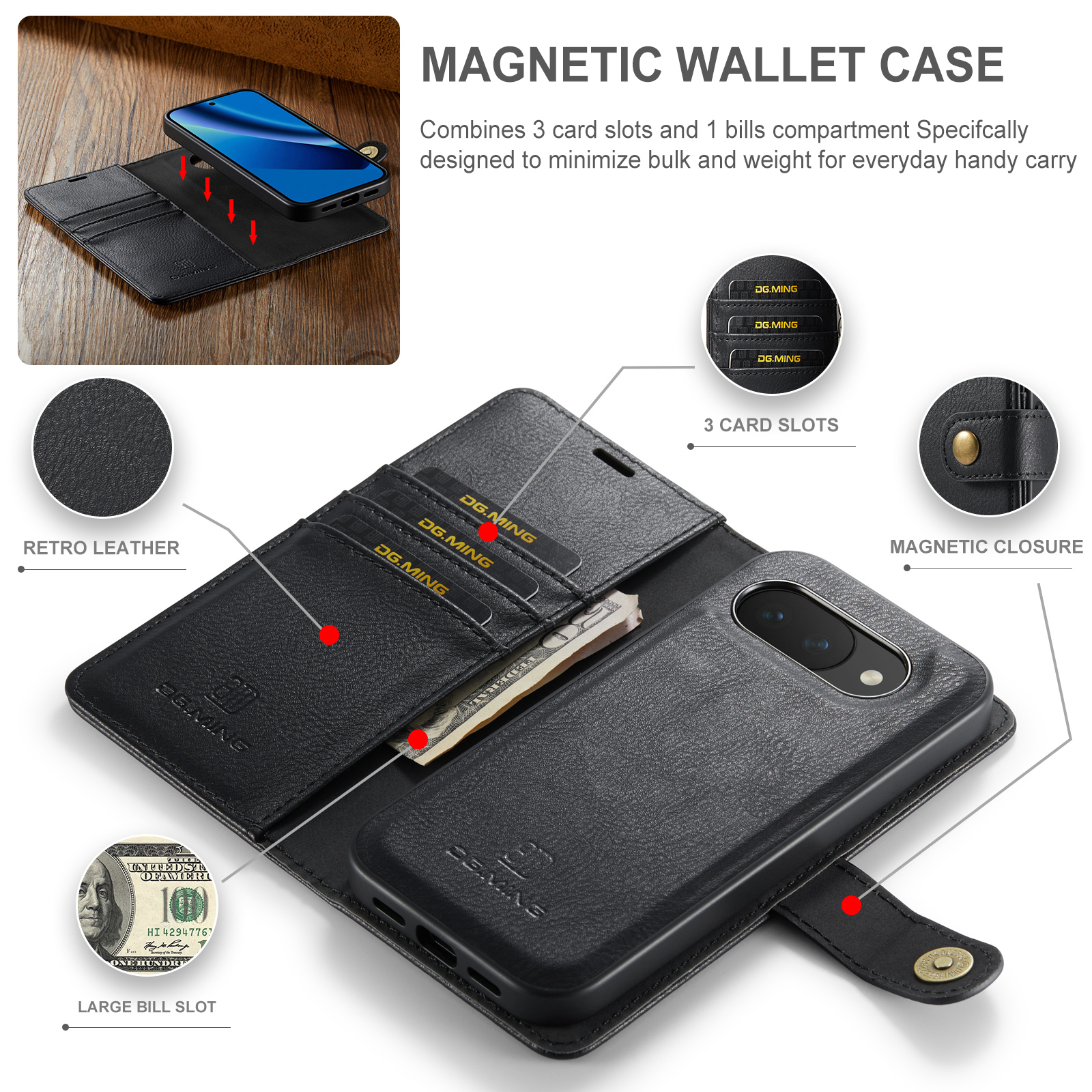 Kolla in vårt smarta fodral med avtagbart magnetskal till Google Pixel 10a från DG.MING. Det här fodralet kombinerar klassisk stil med praktisk funktionalitet. Med det avtagbara skalet kan du enkelt ta bort telefonen från fodralet när du är hemma eller på jobbet, utan att behöva ha med hela fodralet också.