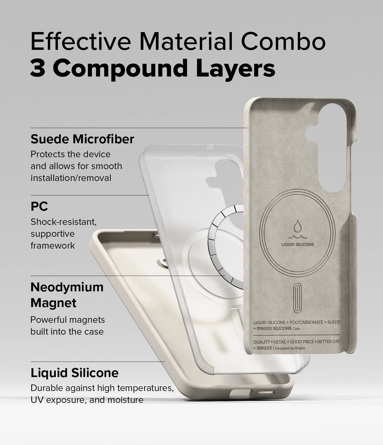 Träffa det superstylade silikonskalet från Ringke för din Samsung Galaxy S25 Plus - din telefon kommer att tacka dig! Med inbyggd MagSafe-funktionalitet blir det busenkelt att klicka fast alla möjliga MagSafe-tillbehör eller slänga telefonen på laddaren utan att behöva pilla bort skalet.