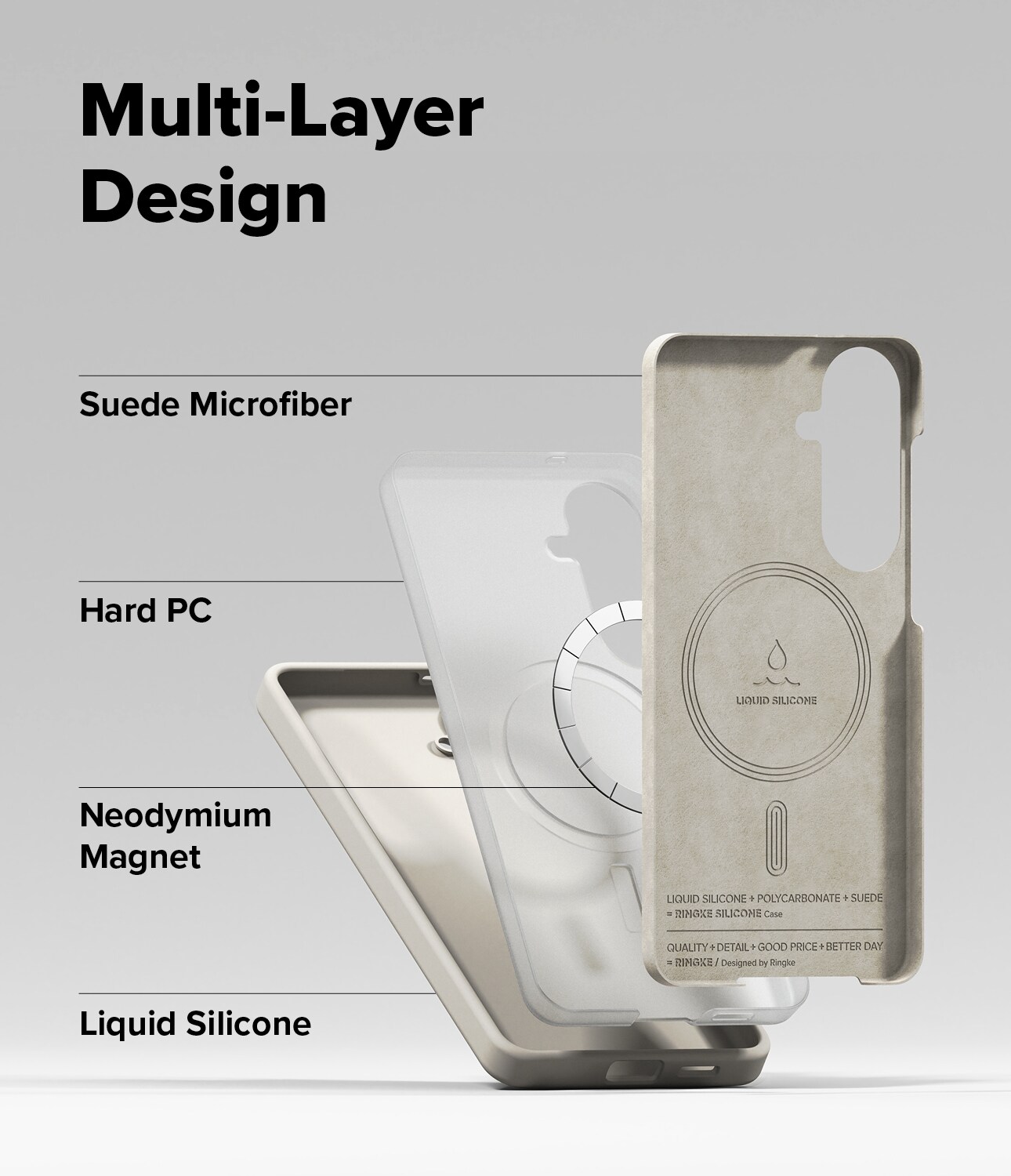 Vad vi har här är ett tredelat skyddspaket: Ytterskiktet i tufft och greppvänligt silikon tar fronten, medan insidan kläs med en kärna av hårdplast för att tackla stötar och en mjuk mikrofiberklädsel på insidan som är snäll mot telefonens fina baksida.