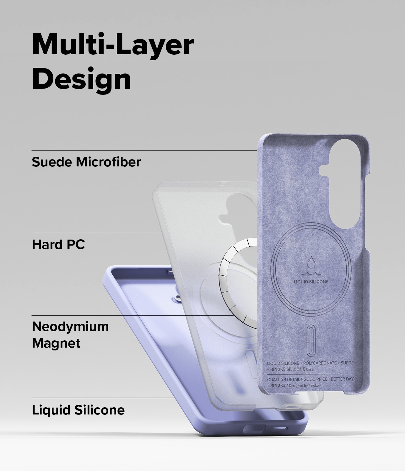 Vad vi har här är ett tredelat skyddspaket: Ytterskiktet i tufft och greppvänligt silikon tar fronten, medan insidan kläs med en kärna av hårdplast för att tackla stötar och en mjuk mikrofiberklädsel på insidan som är snäll mot telefonens fina baksida.