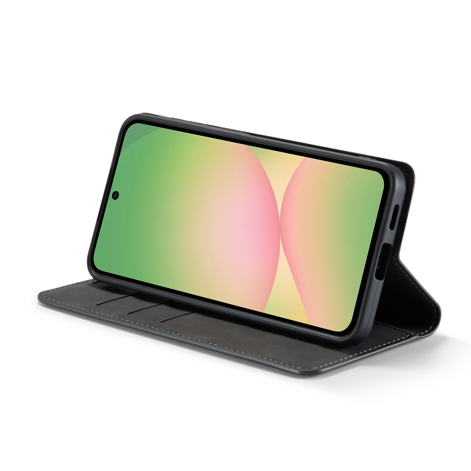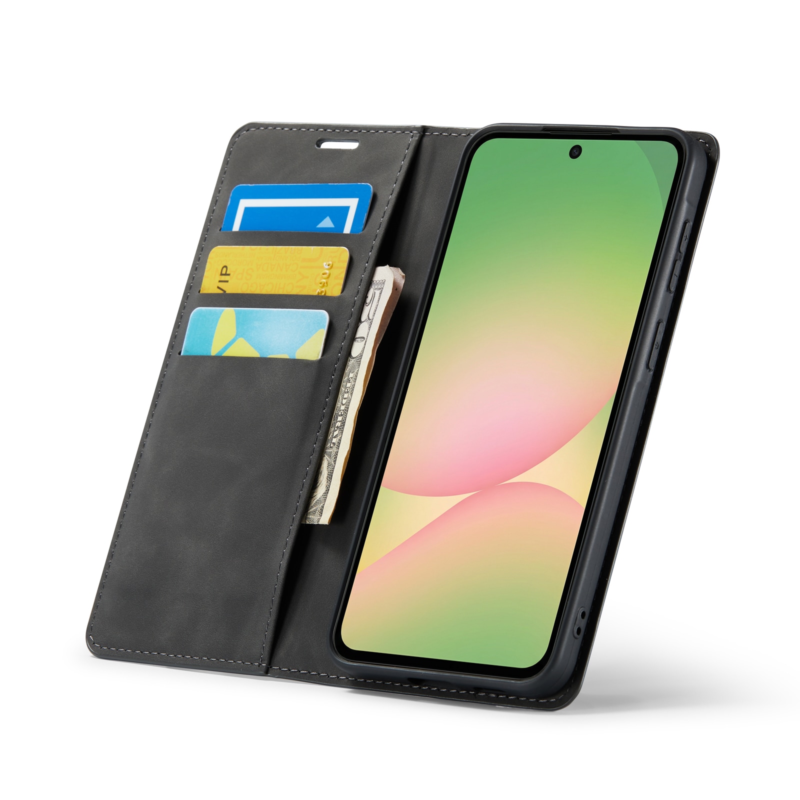 Gör din Samsung Galaxy A57 både praktisk och elegant med detta snygga och slimmade mobilfodral. Med sitt silkeslena omslag i hållbart konstläder och ett stötdämpande TPU-skal på insidan, är din telefon väl skyddad från både repor och tapp. Locket skyddar skärmen när fodralet är stängt, och har plats för två kort samt ett extra fack för kvitton och sedlar, så att du håller enkelt ordning på dina viktigaste saker.
