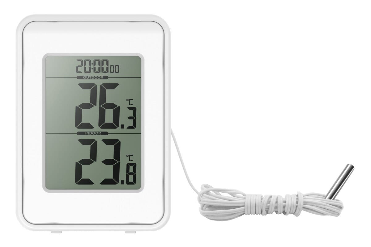 Håll koll på temperaturen både inne och ute med en smidig digital termometer som ger dig all info du behöver på ett ögonblick. Den tydliga displayen visar både inomhus- och utomhustemperatur samt klocka, perfekt för dig som vill ha full kontroll hemma. Den långa sensorkabeln på 2,5 meter gör det enkelt att placera givaren utanför fönstret och få exakta mätningar direkt.