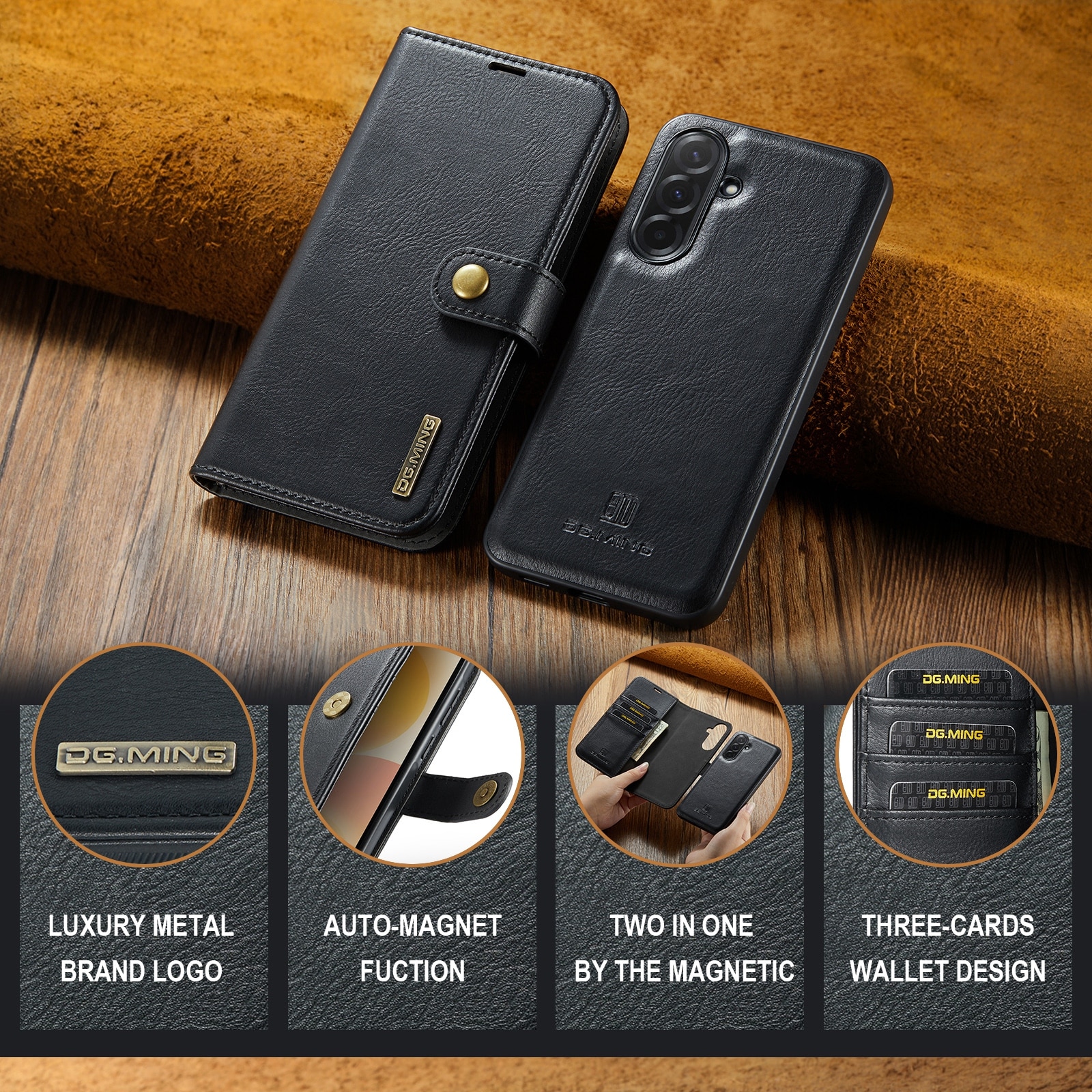 Kolla in vårt smarta fodral med avtagbart magnetskal till Samsung Galaxy A57 från DG.MING. Det här fodralet kombinerar klassisk stil med praktisk funktionalitet. Med det avtagbara skalet kan du enkelt ta bort telefonen från fodralet när du är hemma eller på jobbet, utan att behöva ha med hela fodralet också.