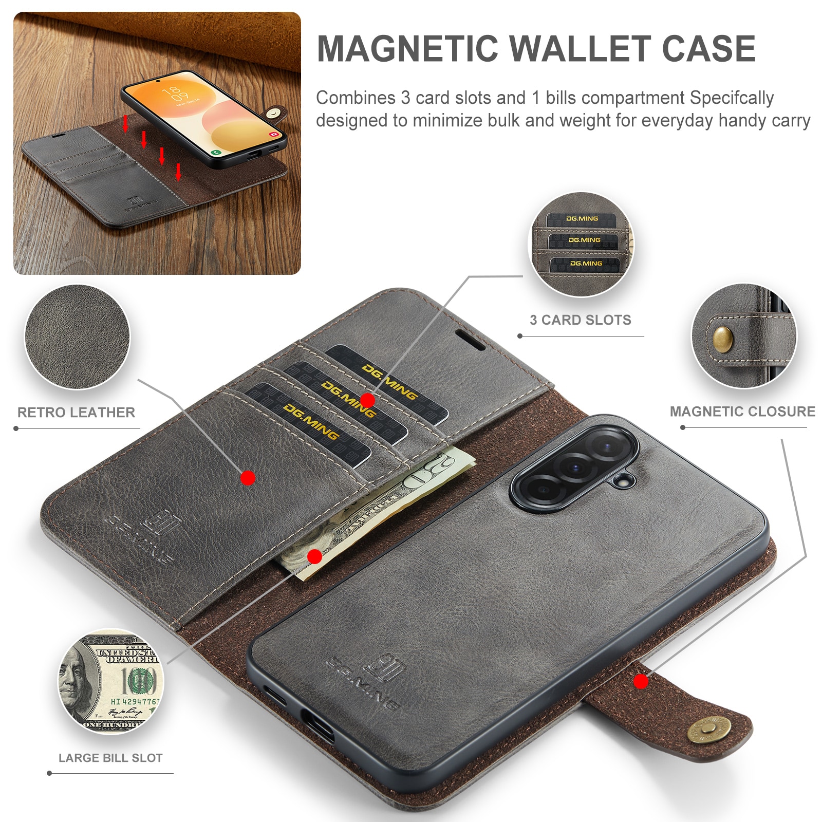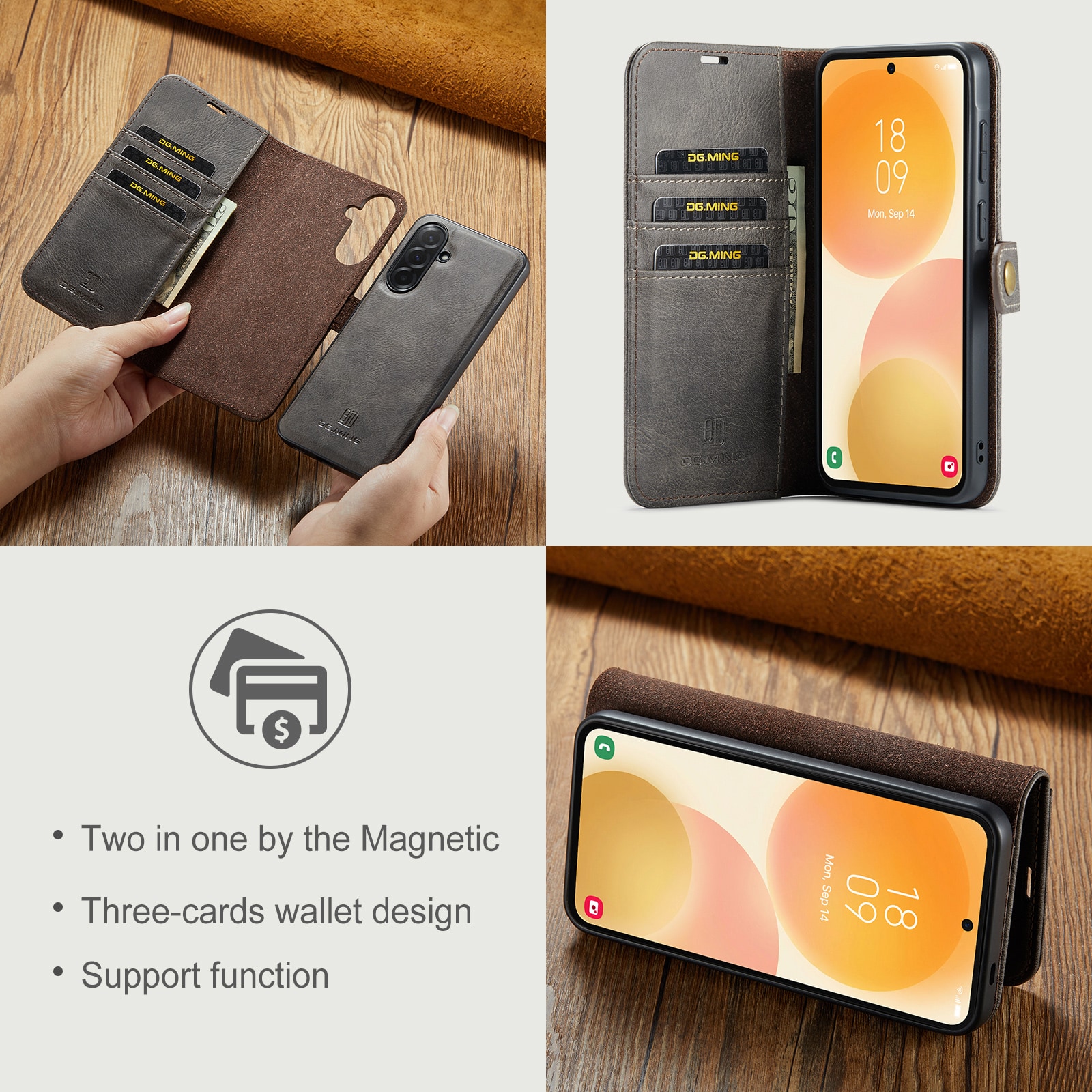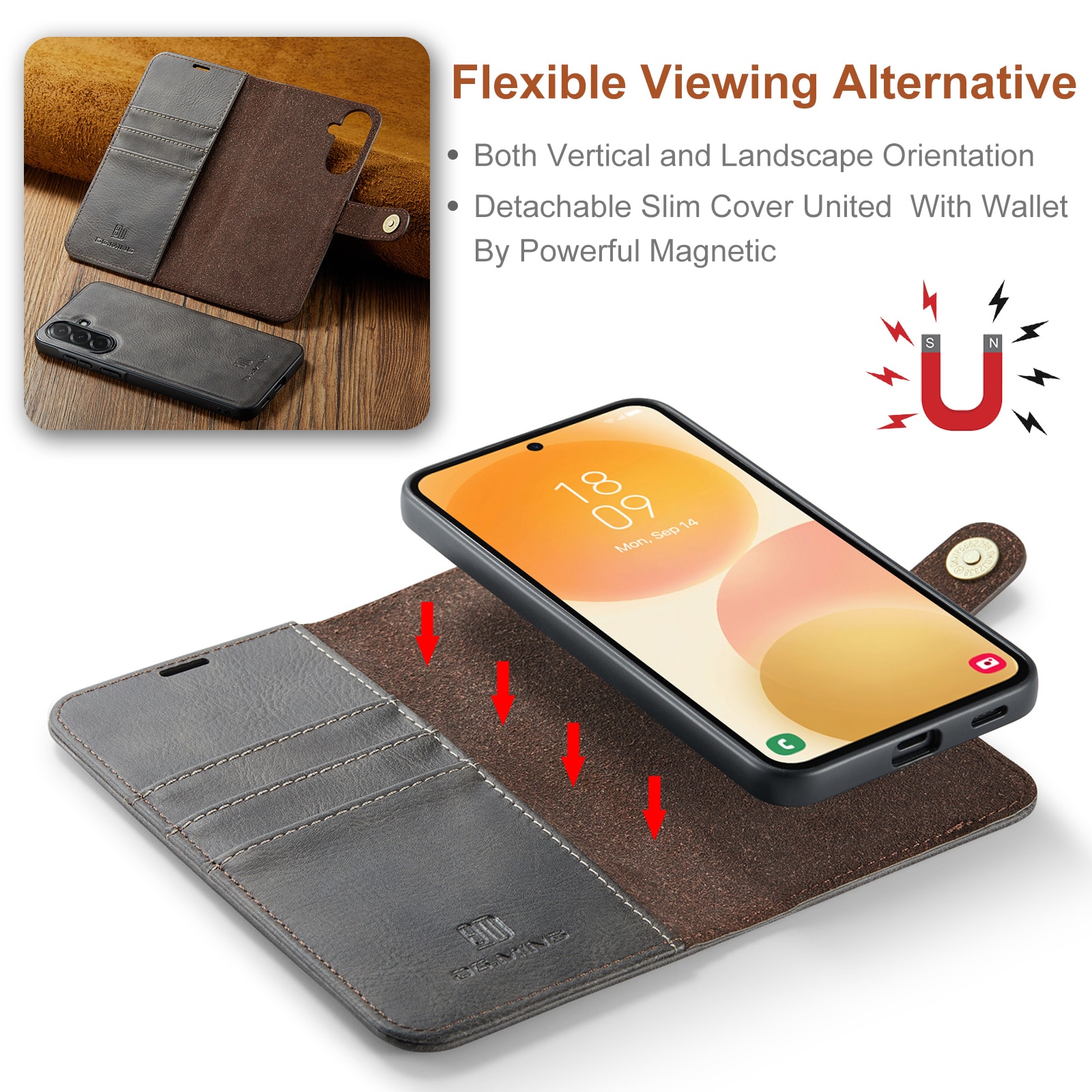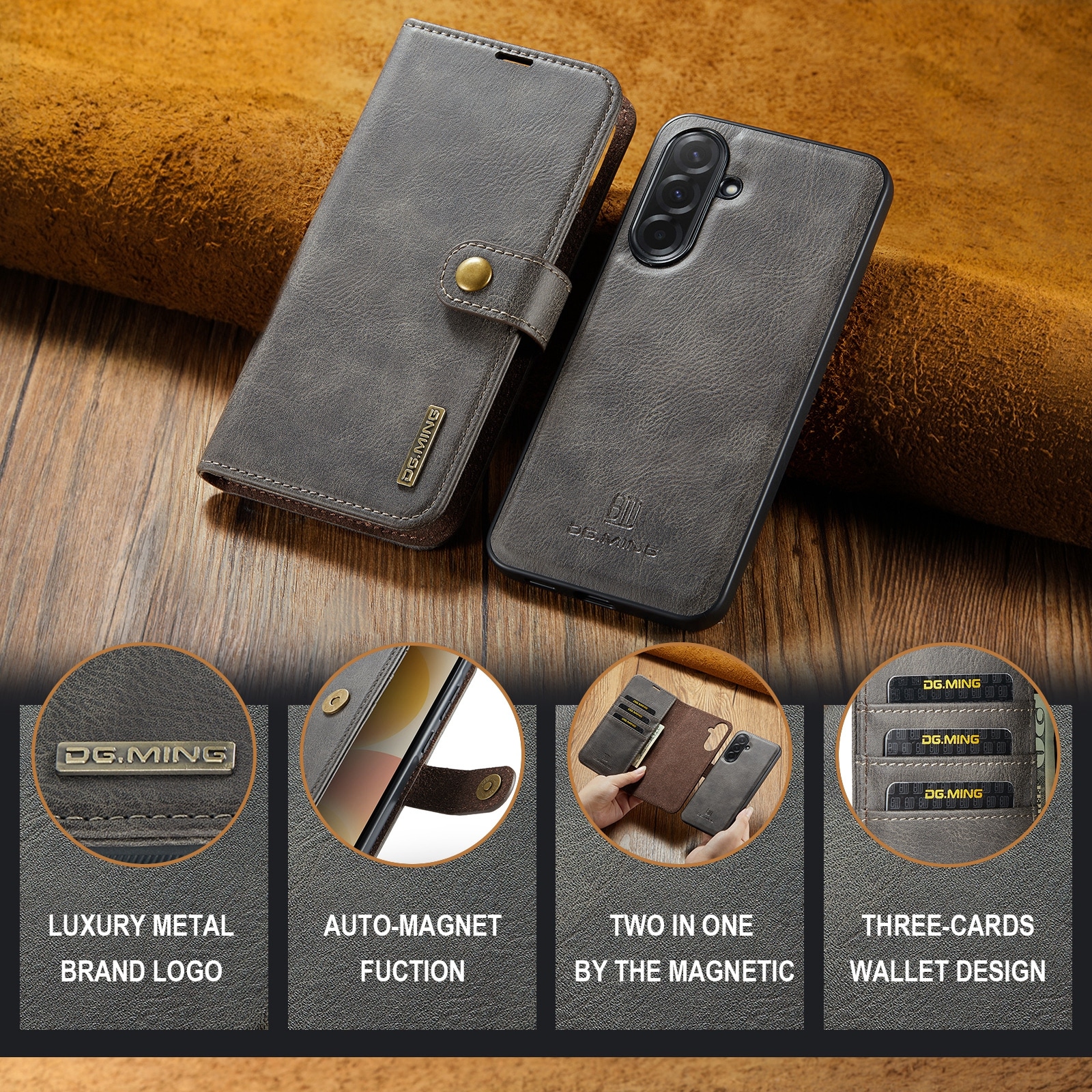 Kolla in vårt smarta fodral med avtagbart magnetskal till Samsung Galaxy A57 från DG.MING. Det här fodralet kombinerar klassisk stil med praktisk funktionalitet. Med det avtagbara skalet kan du enkelt ta bort telefonen från fodralet när du är hemma eller på jobbet, utan att behöva ha med hela fodralet också.