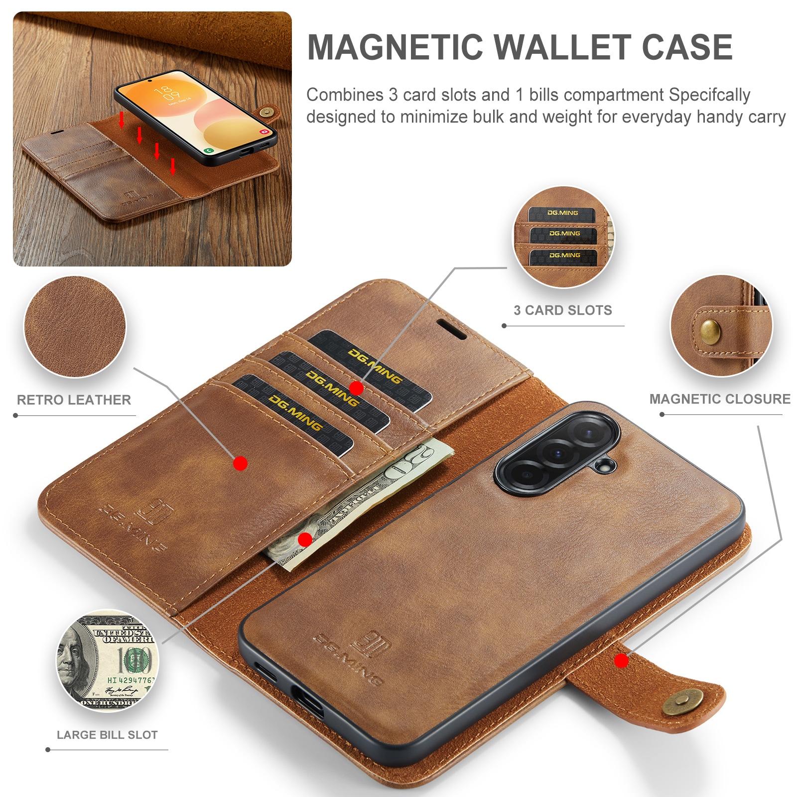 Kolla in vårt smarta fodral med avtagbart magnetskal till Samsung Galaxy A57 från DG.MING. Det här fodralet kombinerar klassisk stil med praktisk funktionalitet. Med det avtagbara skalet kan du enkelt ta bort telefonen från fodralet när du är hemma eller på jobbet, utan att behöva ha med hela fodralet också.